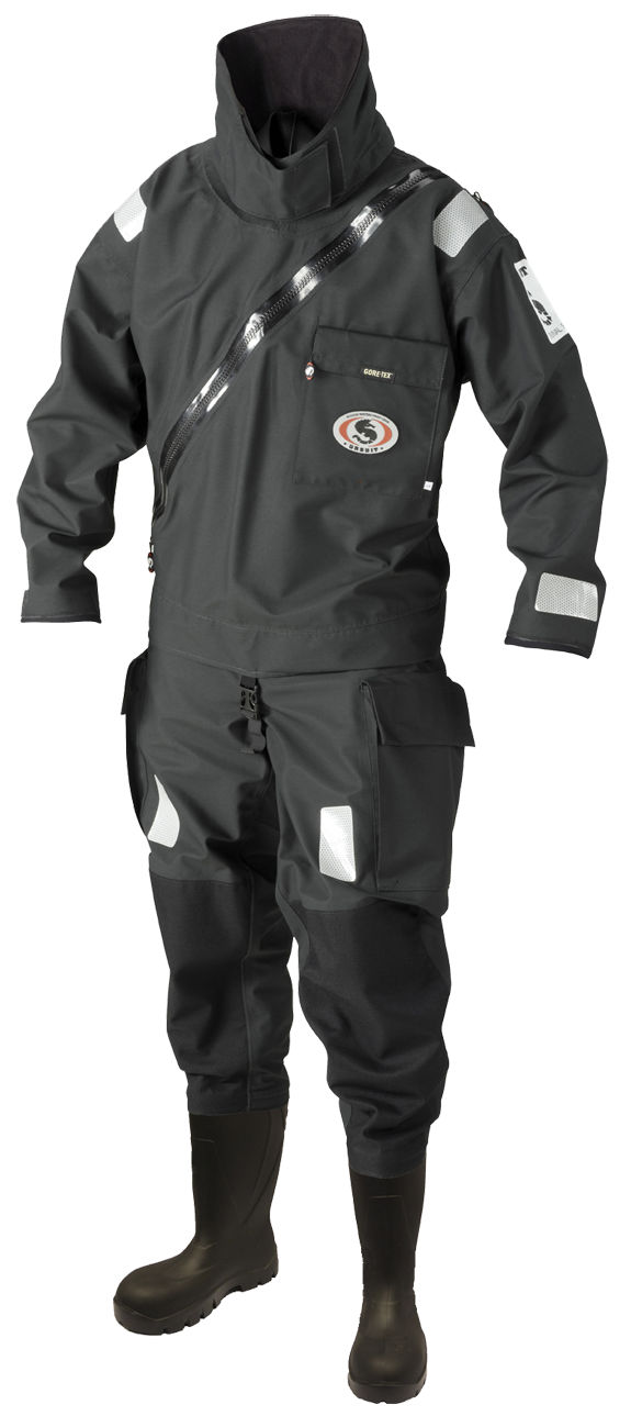Der schwarze Ursuit Sea Horse Überlebensanzug ist für den professionellen Einsatz auf See oder am Wasser konzipiert worden.