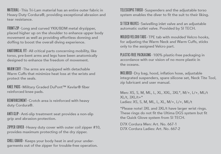 Der D7X Cordura Trockentauchanzug ist die perfekte Wahl für ambitionierte Sport- und Tech-Taucher, die sich auf kompromisslose Haltbarkeit und höchste Sicherheit verlassen möchten. Ob im Kaltwasser, beim Wrack- oder Höhlentauchen – dieser Anzug bietet die Zuverlässigkeit, die du brauchst.