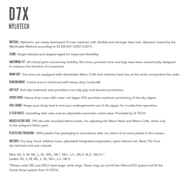 Der D7X Nylotech Trockentauchanzug ist die perfekte Wahl für alle, die einen flexiblen, robusten und langlebigen Anzug suchen. Egal ob im Kaltwasser, bei langen Tauchgängen oder technischen Abenteuern – dieser Anzug liefert kompromisslose Sicherheit und Komfort.